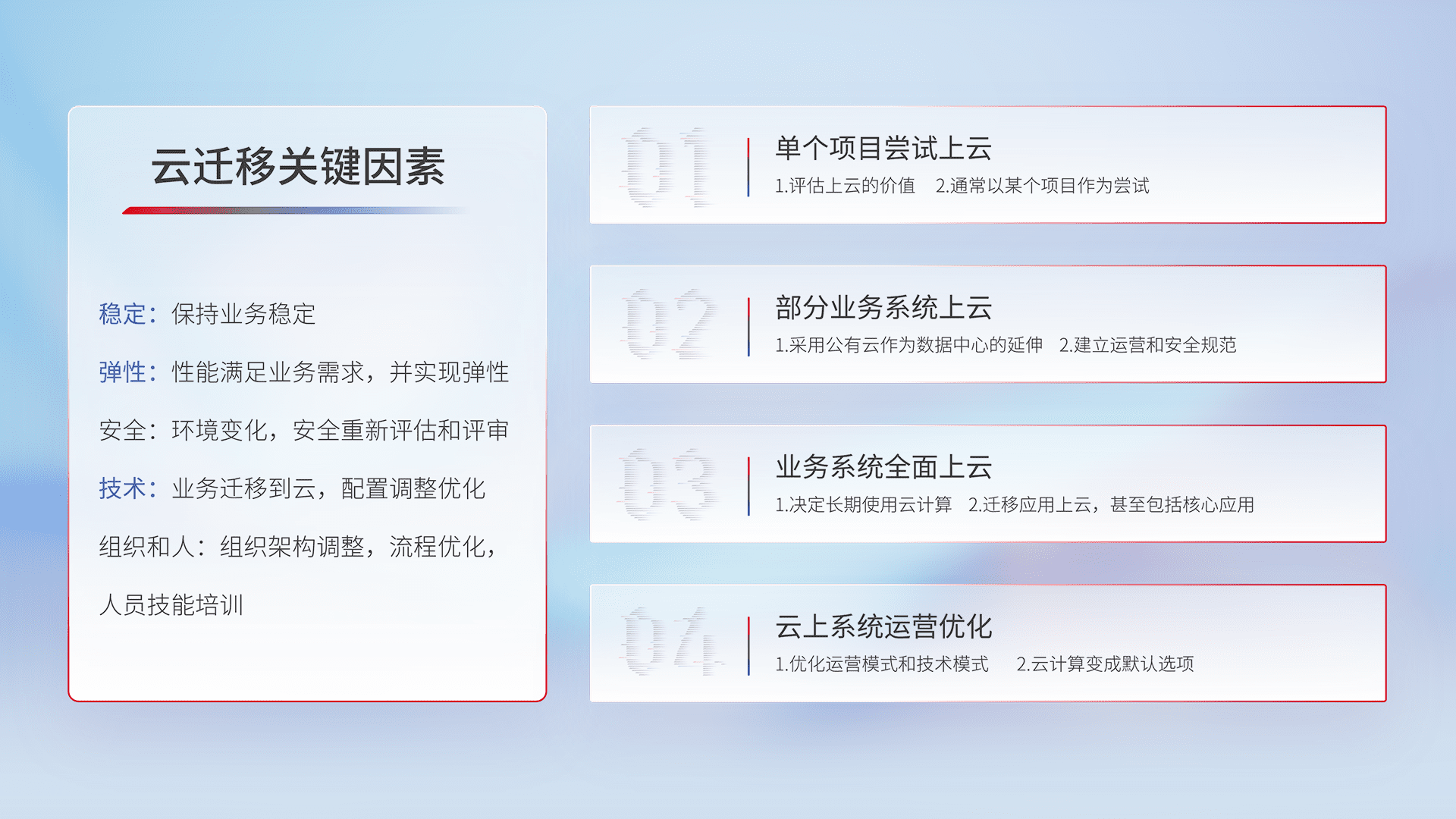 结合实际业务,,,,从规划设计、、、、云平台选型、、云原生改造、、数据迁移、、集成交付,,,迁移全过程为客户识别最佳上云路径,,,,做好风险识别管理,,,,设计网络架构、、、身份权限、、安全审计合规、、、、操作审计、、日志审计、、、、监控告警策略、、、多站点容灾设计等,,,对云上基础设施进行整体规划,,提升IT治理水平,,以满足弹性、、高可用、、高性能的需求。。