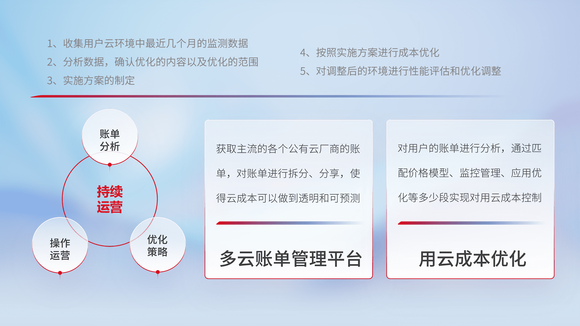 通过多云纳管,,以统一的资源数据模型把客户的云资源进行抽象和封装,,,,进而实现对多云资源的统一操作,,保障云资源管理的可靠性、、、稳定性与可用性。。量身定制化运维内容,,,配置、、开发运维、、、、补丁管理、、、、备份、、、、监控、、、认证和访问管理、、审计和日常巡检等,,保障在用云过程中的可靠度,,稳定度以及高可用率。。。。